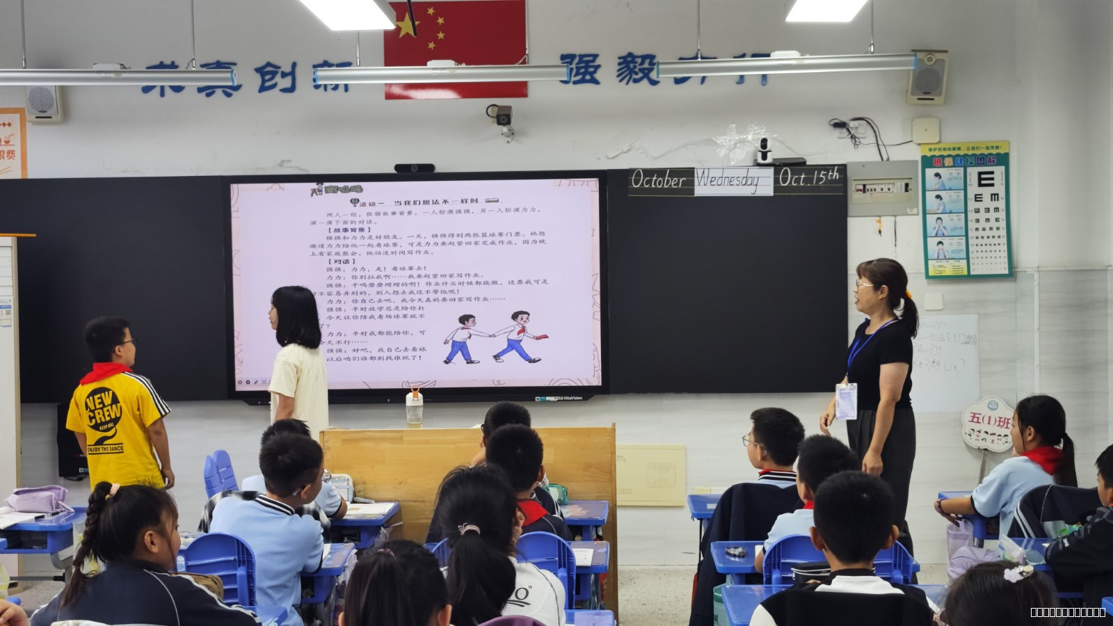 活动伊始,谢文娟老师以“什么是真正的尊重”为切入点,通过课本上的故事片段,生动展现了学生们日常交往中可能引发的矛盾冲突,以及尊重式沟通带来的积极改变。让学生结合自身经历,反思日常交往中可能存在的“隐性不尊重”行为。接着,谢老师用各种生活中的小情境引导学生思考什么是边界,什么是尊重,当你感受到不被尊重时你的体验是什么,如何去尊重你的朋友和家人。最后,谢老师带领学生们一起探讨书上的“尊重契约”,有哪些我们的同学们做得特别好,又有哪些不足之处呢?我们如何加上我们自己的“尊重契约”?通过热烈的小组讨论。学生们都加上了有五1班特色的“尊重契约”,并激励自己在今后的同学交往中努力践行。